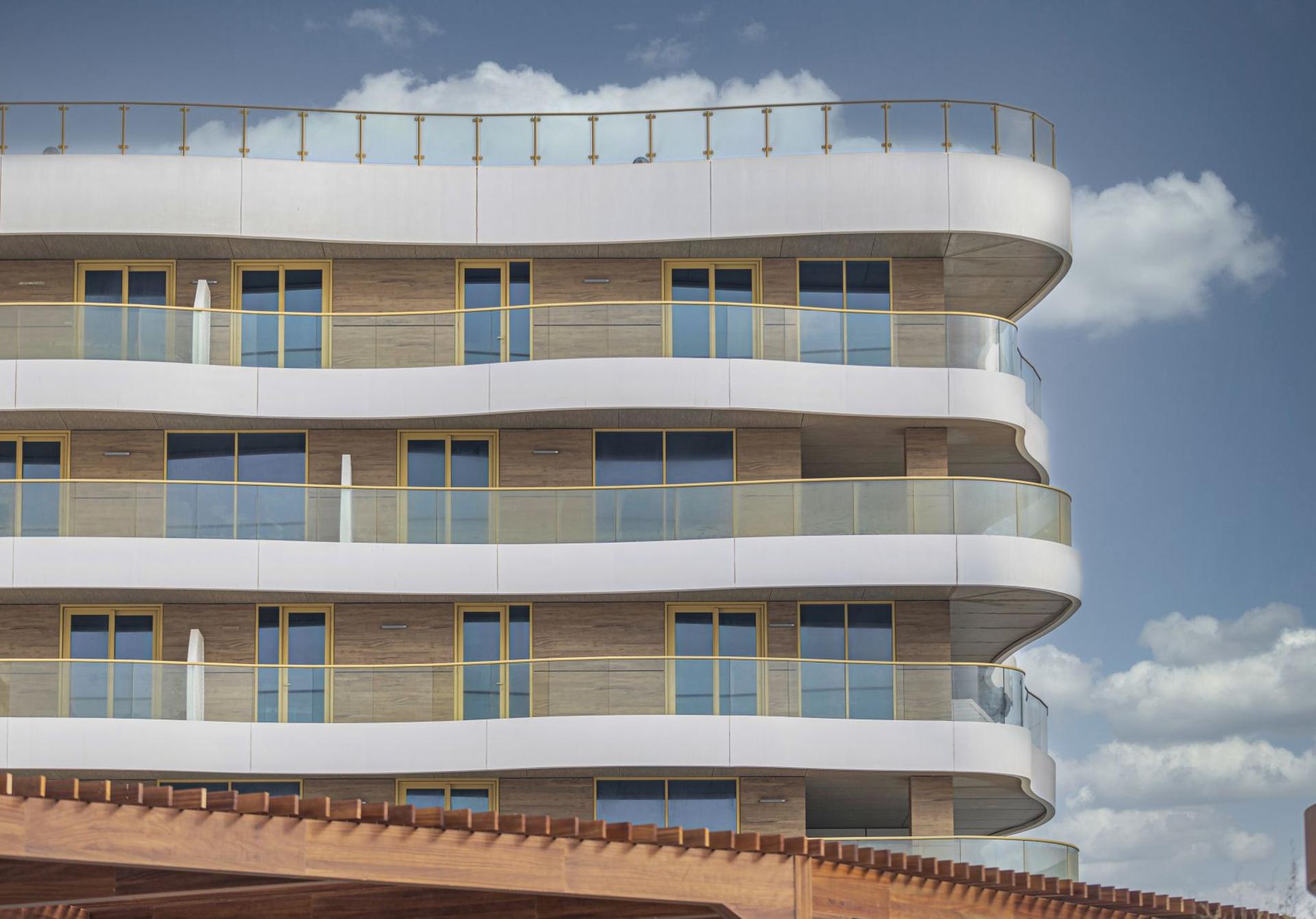 Incluye la instalación de una fachada ventilada de 65.000 metros cuadrados de Dekton, que recubre 12 edificios con más de 1.100 apartamentos. Siguiendo una estrategia integral de planificación maestra, el diseño se inspira en un estilo de vida exclusivo, donde los 40.000 paneles de fachada necesarios se han fabricado a medida.