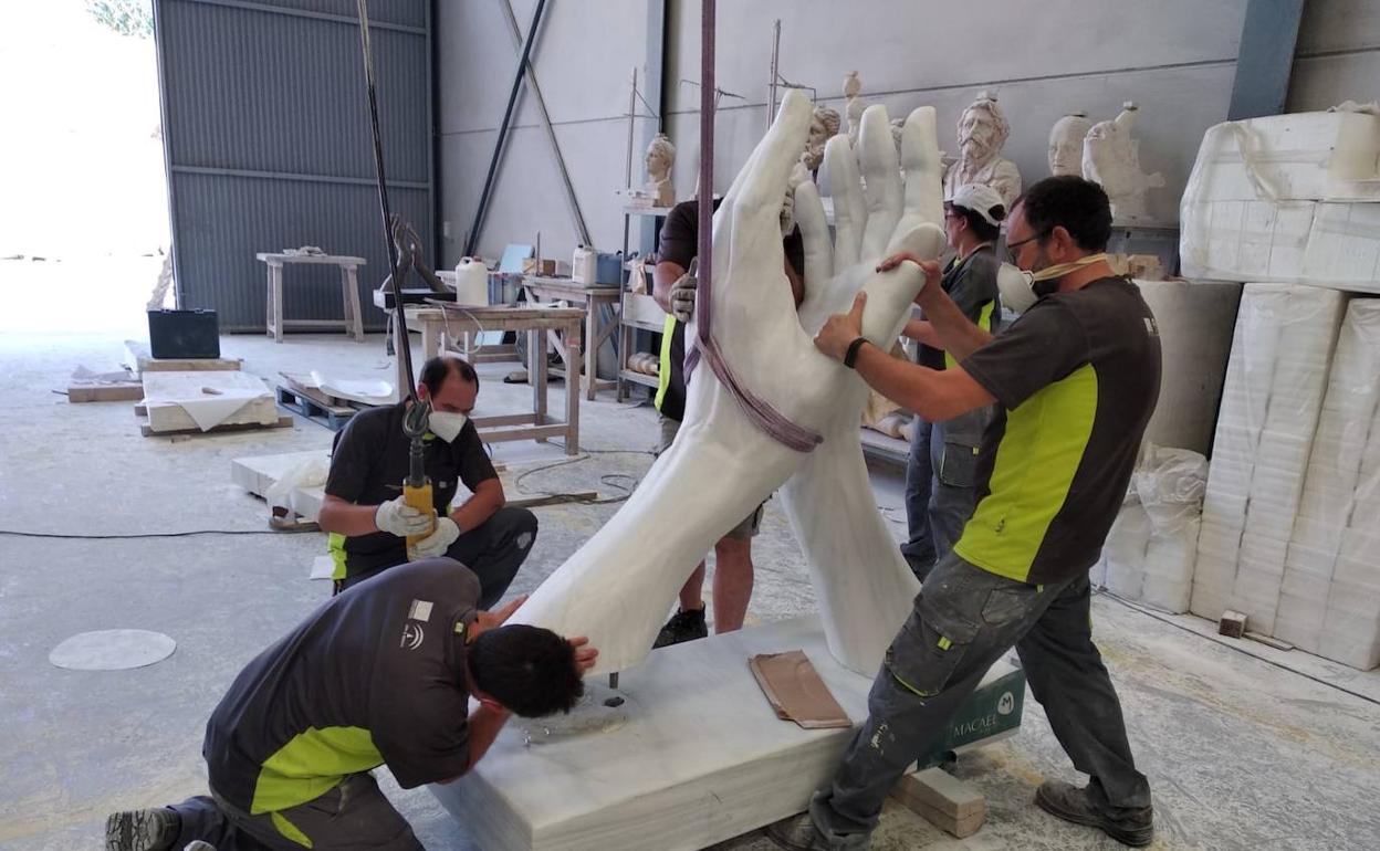 La escultura homenaje a los profesionales que trabajan contra la COVID-19 realizada en la Escuela del Mármol ya luce en Jaén