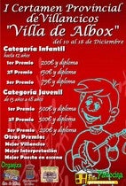 ACTO INAUGURAL: DÍA 10 DE DICIEMBRE A LAS 10.30 H. EN EL SALÓN AYUNTAMIENTO ALBOX A LAS 11.30 H. ACTUACIONES EN EL CENTRO DE OCIO Y COMPRAS LOS LLANOS DE ARBOLEAS: CORO INFANTIL DE LA ESCUELA DE MÚSICA DE ALBOX CORO JUVENIL DE LA ESCUELA DE MÚSICA DE ALBOX CONSERVATORIO ELEMENTAL DE MÚSICA DE ALBOX DÍA 14 DICIEMBRE, A LAS 16.30 H. EN EL SALÓN DE ACTOS DEL AYUNTAMIENTO DE ALBOX EN C/ ROSARIO, 27: -CORO INF.CONSERVATORIO ELEMENTAL DE MÚSICA DE OLULA DEL RIO -CORO INF. ESCUELA DE MUSICA DE LA ASOC. CULTURAL MUSICAL DE MACAEL DÍA 15 DICIEMBRE, A LAS 16.30 H.EN EL SALÓN DE ACTOS DEL AYUNTAMIENTO DE ALBOX EN C/ ROSARIO, 27: -CORO INFANT. CONSERVATORIO ELEMENTAL DE MÚSICA DE CUEVAS DEL ALMANZORA -CORO INFANTIL DEL CEIP VELÁZQUEZ DE ALBOX DÍA 16 DICIEMBRE, A LAS 16.40 H. EN EL SALÓN DE ACTOS DEL AYUNTAMIENTO DE ALBOX EN C/ ROSARIO, 27: -CONJUNTO VOCAL E INSTRUMENTAL DEL IES JAROSO DE CUEVAS DE ALMANZORA ?JUVENIL -CORO IES CARDENAL CISNEROS DE ALBOX-JUVENIL DÍA 17 DICIEMBRE, A LAS 11.00 H. EN EL CENTRO DE OCIO Y COMPRAS LOS LLANOS DE ARBOLEAS: -CORO INF. CEIP NTRA.SRA. DE LA ASUNCIÓN DE ARBOLEAS -CORO INF. CEIP VIRGEN DEL SALIENTE DE ALBOX DÍA 18 DICIEMBRE, A LAS 11.00 H. CLAUSURA Y ENTREGA DE PREMIOS DEL I CERTAMEN PROV. DE VILLANCICOS VILLA DE ALBOX ,EN EL SALÓN DE ACTOS DEL AYUNTAMIENTO DE ALBOX ACTUACIONES DE: -CORO INFANTIL DE LA ESCUELA DE MÚSICA DE ALBOX -CORO JUVENIL DE LA ESCUELA DE MÚSICA DE ALBOX