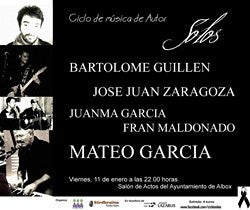 Después del éxito cosechado en los cuatro conciertos anteriores, el Ciclo de Música de Autor 'Solos' se despide de su primera edición con una de las propuestas más esperadas. El Ayuntamiento de Albox, a través de la Concejalía de Cultura, y Birdbrains Producciones organizan esta cita musical para el próximo día 11 de enero, a las 22.00 horas, en el salón de actos Federico García Lorca en el consistorio albojense. En esta ocasión, los invitados protagonistas del evento son los artistas locales: Bartolomé Guillén, José Juan Zaragoza, Juanma García, Fran Maldonado y Mateo García. Cinco grandes músicos que ofrecerán lo mejor dentro de este nuevo concierto de 'Solos'.