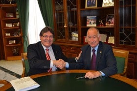 El presidente de la Diputación de Almería, Gabriel Amat (PP), y el alcalde del Ayuntamiento de Albox, Rogelio Mena (PSOE), han firmado este lunes en el Palacio Provincial el convenio de colaboración por el que la institución provincial financiará parte de los gastos de funcionamiento del Parque de Bomberos con el que cuenta el municipio.