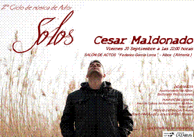 El próximo Viernes a las 22 horas se inaugura la 2ª edición del Ciclo de Música de Autor con la actuación de César Maldonado en el salón de actos "Federico Garcia Lorca" del Ayuntamiento de Albox, en la que presentará su álbum titulado "El Zaguan".