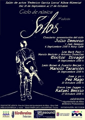 Esta tercera edición, que se celebra entre los meses de septiembre y octubre, programa cuatro actuaciones. El primero de los conciertos, el 19 se septiembre, a cargo de Manolo Bertrán y Antonio Chumillas, formato acústico del grupo valenciano Doctor Divago. El 26 de septiembre participará, el también músico y cantante valenciano, Manolo Tarancón. La tercera cita, programada para el 10 de octubre, contaremos con la música del madrileño Lucas "Pez Mago". El ciclo se cerrará el 17 de octubre con la actuación del músico y poeta donostiarra Rafael Berrio. En cada una de las citas programadas, como presentación del mismo, actuarán en acústico músicos locales bajo los nombres de "Low Back Pain", "León Brown y Juanito Verjas", "Jose y yo" y "Steve Lee Jagger". El Ciclo de Música "Solos" es un proyecto cultural y altruista, que cumple tres años, promovido por el Área de Cultura del Ayuntamiento de Albox y Birdbrains Producciones para el acercamiento y fomento de la música en un formato más íntimo al público en general, y que cuenta la sonorización de Juanvi Aznar y la colaboración Pittassound Prom, Musicalia Radio, A. Campoy y Diputación de Almería, así como de una veintena de empresas y personas que apoyan económicamente la realización de este ciclo de música. Todos los conciertos tendrán lugar a las 22:00 horas en el salón de actos Federico Garcia Lorca del Ayuntamiento de Albox. El precio de la entrada para cada uno de los conciertos des de 2 euros y el bono para las cuatro citas 5 euros. Puedes informarte en el numero 663732899 o a través de redes sociales www.facebook.com/ciclosolos o @ciclosolos.