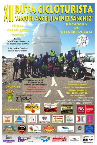 El próximo día 5 de octubre Tíjola acogerá la XII Ruta Cicloturista 'Miguel Ángel Jiménez Sánchez'. El objetivo de este encuentro es llegar al Calar Alto, por la carretera de Bacares, de esta forma, puede hacerse la subida tanto con bicicleta de montaña, como con bicicleta de carretera. El recorrido, siempre exigente, de iniciará a las 9 de la mañana desde Tíjola