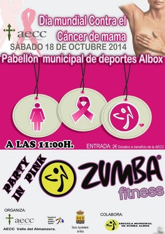 La primera de estas citas es el sábado 18 de octubre en el pabellón municipal de deportes de Albox donde se ha organizado (en colaboración con el Ayuntamiento albojense con su concejalía de juventud y deporte a la cabeza y la escuela municipal de zumba de esta localidad), una sesión de Zumba Fitness denominada 'Party In Pink' a partir de las 11:00 h de la mañana; cita ineludible para los amantes de esta mezcla de baile y ejercicio que por sólo 2 euros la entrada colaborarán con esta iniciativa. La segunda de estas actividades se celebra el domingo 19 en las pistas municipales de pádel de Olula del Río y se trata de un torneo de pádel femenino. Aprovechando el «boom» de este deporte en el Almanzora, la junta local de la AECC de Olula del Río (con la labor infatigable de la coordinadora comarcal Loli Señor y con la ayuda colaboradora del Ayuntamiento y del Club de Pádel local), ha organizado este torneo para la implicación del mayor número de jugadoras que sea posible. La inscripción sólo será de 10 euros para la ayuda y también se podrán hacer donativos en las propias instalaciones. El torneo tendrá el formato de «parejas sorteadas» y cada participante recibirá una camiseta de regalo.