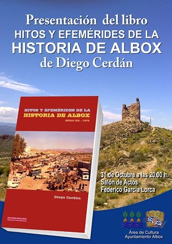 El salón de actos Federico García Lorca del Ayuntamiento de Albox acogerá el día 31 de octubre la presentación de 'Hitos y efemérides de la historia de Albox: siglo XII -1975'. Se trata del último fruto literario del autor Diego Cerdán. Una obra inédita que recopila por primera vez pasajes inéditos y de gran relevancia para la historia de Albox