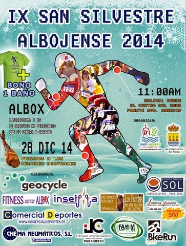 La Concejalía de Deportes, Juventud y Cultura del Ayuntamiento de Albox y la Asociación Cultural Somos Albojenses, organizan la IX Edición de esta carrera popular , ... una propuesta que tendrá lugar el próximo domingo 28 de diciembre del 2014. La hora de inicio según las bases es a partir de las 11 de la mañana, estableciéndose un total de 14 categorías. Una de las novedades con la que cuenta este año la carrera es la salida y llegada de la misma, situada en el Centro Deportivo Agua y Salud de Albox