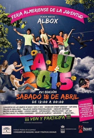 El municipio de Albox acogerá el ... sábado 18 de abril a cientos de jóvenes almerienses procedentes de municipios de toda la provincia de Almería en la XVI Edición de la Feria Almeriense de la Juventud (FAJÚ). Una cita destinada a losjóvenes, de entre los 16 y 30 años organizada por el Instituto Andaluz de la Juventud de la Junta de Andalucía y el Ayuntamiento de Albox. En esta ocasión el punto de encuentro de todos los participantes será la Plaza Mayor, que acogerá una cita donde no faltarán numerosas exposiciones, talleres, conciertos, gimkanas y juegos, entre otras muchas actividades culturales y deportivas. La XVI Edición de Fajú se celebrará desde las 12.00 hasta las 00.00 horas. Durante este periodo de tiempo, los jóvenes tendrán la opción de participar en las siguientes actividades: exhibición street workout, decatlón olímpico, taller de abalorios, taller de chapas personalizadas, creación artística, master class de zumba, conoce Europa, exposiciones y proyecciones. Además, entre las acciones que se están preparando destacan: Dj Profesional, speaker, competición de baile Freestyle, clase de animación salsa, actuación de Beatbox, batalla de gallos y set fotográfico profesional, entre otras. Una vez que caiga la noche, Albox acogerá conciertos musicales para poner el broche de oro a una jornada que ofrecerá todos los ingredientes necesarios para una inolvidable convivencia entre jóvenes de toda la provincia de Almería. Además se proyectarán piezas audiovisuales en el salón de actos Federico García Lorca y se expondrán obras artísticas en el Patio de Luces del Ayuntamiento. Los comercios y locales de la localidad también han querido formar parte de este día histórico para el municipio con descuentos para los participantes en esta Feria Almeriense de la Juventud. Los jóvenes también podrán compartir e intercambiar experiencias, a través de las diferentes propuestas que se pondrán en marcha. La asistencia y participación es gratuita. A la cita, a la que se espera que acudan cientos de jóvenes procedentes de todos los municipios de la provincia de Almería, también acudirán numerosas asociaciones juveniles y culturales, fundaciones, centros de información juvenil municipales y y grupos de corresponsales juveniles que han querido sumarse a una atractiva jornada que entre otras cosas servirá como escaparate de las actividades que se desarrollan durante todo el año en Albox. El alcalde del Ayuntamiento de Albox, Rogelio Mena, ha manifestado que "este año, la Feria Almeriense de la Juventud viaja de nuevo hasta nuestro municipio y nosotros estamos encantados de convertirnos en la sede del evento juvenil más importante del año en la provincia. Los jóvenes son los únicos protagonistas de esta propuesta, ya que su finalidad es fomentar la participación juvenil creando espacios de encuentros y diálogos. Desde el Ayuntamiento de Albox siempre apostamos por fomentar la participación activa de nuestros jóvenes en la sociedad y también necesitamos conocerlos y acercarnos a ellos para diseñar nuestras políticas de juventud". Por su parte, el concejal de Juventud, Francisco Carrillo, ha invitado "a todos los jóvenes tanto de Albox como de otros municipios de la provincia de Almería a que se acerquen el próximo sábado hasta Albox. La programación enmarca actividades culturales, deportivas, talleres y conciertos, entre otras alternativas. Además se ubicarán stands informativos, donde los colectivos darán a conocer las acciones que llevan a cabo en materia de juventud. Esta feria sirve como continuación de las decenas de propuestas culturales y deportivas que el Ayuntamiento de Albox prepara cada año para nuestros jóvenes". Fajú nació en el año 1997 como una jornada formativa e informativa. El programa diseñado para el día 18 de abril prevé una duración de 12 horas aproximadas de convivencia, actividades y trabajo. Sobre las doce de la mañana se tiene prevista la recepción y acreditación de los participantes. A continuación se desarrollarán una primera sesión de talleres en la Plaza Mayor, que se alargará hasta las siete de la tarde. El encuentro juvenil finalizará con los conciertos y las actuaciones.