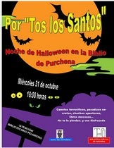 ¿Quieres pasar una noche terroríficamente divertida? Pásate por la Biblioteca de Purchena el miércoles 31 de octubre a partir de las 18 horas para celebrar con nosotros la noche "Por Tos Los Santos", más conocida ahora por la Noche de Halloween. Cuentos de terror, pasadizos secretos, chuches apestosas, libros mocosos, pelis de miedo... Para todos los públicos. La actividad cuenta con la colaboración de los Corresponsales Juveniles del Centro de Información Juvenil de Purchena y el Guadalinfo. Organiza y patrocina Ayuntamiento y Biblioteca Pública de Purchena.