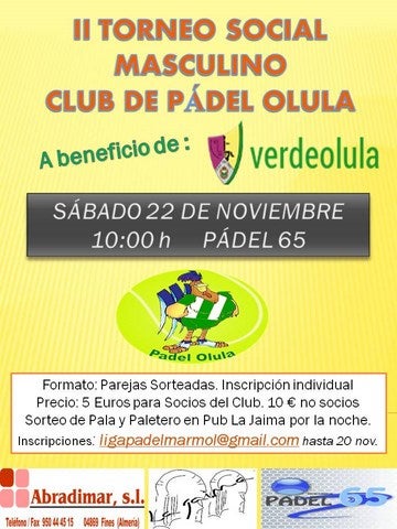 Pues todos los que amamos el pádel y queremos aportar nuestro granito de arena para esta gran función de nuestros amigos de la ASOCIACIÓN VERDEOLULA tenemos una cita ineludible este sábado en las Pistas de Pádel 65, situadas en el polígono de Olula del Río, para vivir una fiesta tanto deportiva como solidaria. El torneo tendrá un formato de parejas sorteadass, con una inscripción individual de tan solo 5 ? para los socios del Club de Pádel Olula, y 10 ? para los no socios. También tenemos que indicar que después del torneo se celebrarán los típicos sorteos que se llevan a cabo en los torneos organizados por el Club, que siempre son un aliciente para los participantes, pero que en este caso debe de ser lo de menos porque mayor aliciente que el apoyo de nuestros niños de la ASOCIACIÓN VERDEOLULA no existe. Aún estáis a tiempo para apuntaros hasta el día 20 en http://ligapadelmarmol.blogspot.com.es/