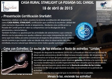 Este sábado, 18 de abril tendrá lugar la presentación oficial del certificado celebrando este acto con una cena con estrellas "al encontrarnos esa noche en ... fase de luna nueva y unas especiales noches de oscuridad que nos permitirá disfrutar de galaxias distintas a la nuestra especialmente situadas esa noche en el cielo y lluvias de estrellas Líridas o constelación de Lira ", indican desde el establecimiento.