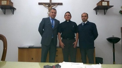 . El párroco de Purchena, Felipe Alfonso De Mendoza Alemán, ha recibido del director de "la Caixa" en Macael, Francisco José Martínez Sánchez y empleado José Francisco Pastor Guijarro, 16 vales de la campaña "Calzado con estrella". Una campaña que tiene por finalidad rebajar el esfuerzo económico que supone para muchas familias la adquisición de calzado de manera periódica.