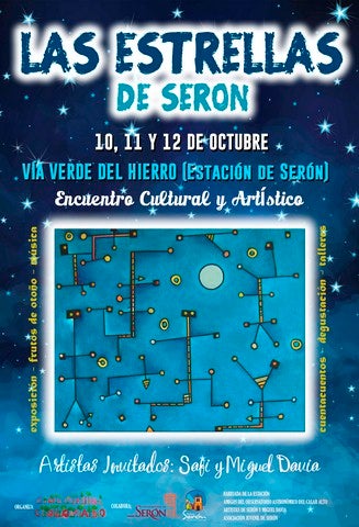 La Estación de los Cuentos, el grupo Cultural Colorín Colorado, vecinos del municipio de Serón, artistas y el Ayuntamiento de esta localidad, han organizado un ... encuentro cultural, astronómico, artístico y gastronómico que tendrá lugar los días 10,11 y 12 de Octubre en el espacio natural de la Vía Verde del municipio.