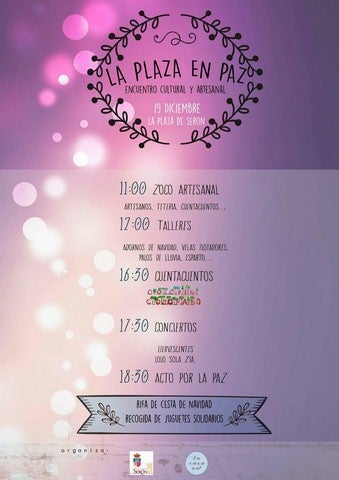 La plaza Nueva del ayuntamiento de Serón, celebra mañana el primer encuentro cultural artesanal, 'La plaza en Paz, donde artesanos y artistas locales exponen ... productos y actividades durante todo el día. La iniciativa ha partido de los empresarios de la asociación cultural, artística y artesanal, la Casa nº 7 de Serón, que han planificado la actividad pensando en dar a conocer sus productos a los visitantes de los fines de semana a la vez que compartir una jornada lúdica y de convivencia previa a las fiestas navideñas; donde además los asistentes podrán adquirir regalos de navidad originales y totalmente artesanales. Los actos se iniciarán a partir de las 11 de la mañana con el zoco artesanal, seguido a las doce del mediodía de talleres destinados al público en general, haciendo incidencia en los más pequeños; entre estos talleres de esparto, velas flotadores, palos de lluvia o adornos de navidad. A las 16,30 el grupo Colorín colorado, que gestiona La Estación de Los Cuentos de esta localidad, llevará a cabo un cuenta cuentos con relatos donde podrán participar los asistentes. Continuarán los actos a las 17,30 horas con conciertos de los grupos Efervescentes y Lolo Sola CIA; finalizando las actividades a las 18,30 con un acto por la paz. Durante la jornada se llevará a cabo también una recogida de juguetes solidarios y la rifa de una cesta de navidad. El evento, organizado por el grupo cultural 'La casa Núnero 7' , ha contado con la colaboración del ayuntamiento y los centros educativos del municipio, cuyos niños y niñas han preparado durante varias jornadas los farolillos que adornarán la plaza Nueva. Varias son las empresas que estarán presentes, en el encuentro, entre estas: Artesanía El Valle (artesanía en madera) Marta Sánchez (jabones naturales) Lolo Sola (pan rústico) Jenny Jiménez (Artesanía utilitaria, Lámparas y espejos. Bastones de senderismo) ChiliConChocolate Artesanía (bolsos exclusivos) Maribel Sola (Vestidos de diseño original) Asociación Juvenil de Serón (Amigurumis) Sol Stevia (stevia) Mónica (velas aromáticas) Cerbaza (cerveza artesanal) Antonio (Miel de Serón) José Molina (atrapa sueños) Tetería Frauke ( Tés del mundo y galletitas alemanas)
