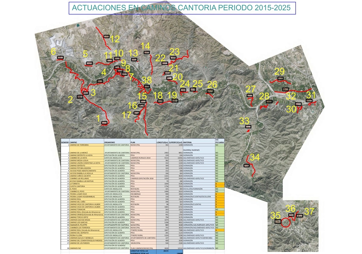 Entre las actuaciones recogidas en el resumen de intervenciones 2015-2025 figuran caminos como: Camino Real (5.514 m, Junta de Andalucía – Plan Caminos Rurales 2018); Camino Depósito (1.847 m, Itinere Rural – Junta de Andalucía); Camino de La Hoya (1.359 m, Diputación de Almería); La Torreta (1.681 m, PFEA – Diputación); Caminos Los Terreros (3.028 m, Plan Municipal); Camino Viejo de Cantoria a Albox (actuaciones Restaura – Junta de Andalucía) o Camino de La Mercé, Camino Oribique, Caminos Gachasmigas o Caminos El Púlpito, ejecutados con financiación municipal.